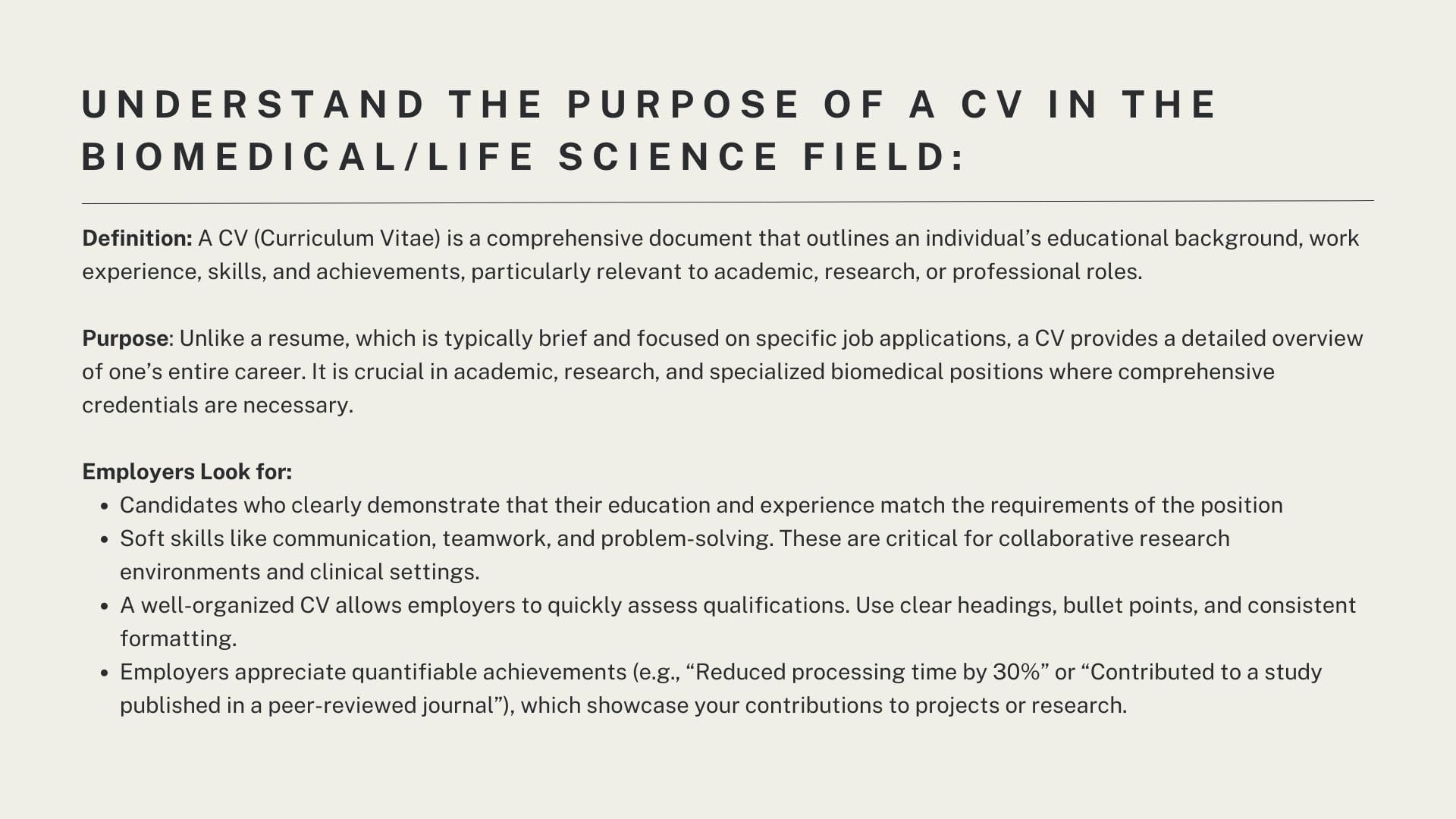 Are you ready to create a CV that opens doors to coveted positions in the biomedical, healthcare and related industries? This comprehensive guide is your ultimate resource for understanding what hiring managers and recruiters are looking for, how Applicant Tracking Systems (ATS) work, and how to craft a CV that shines in a competitive job market.